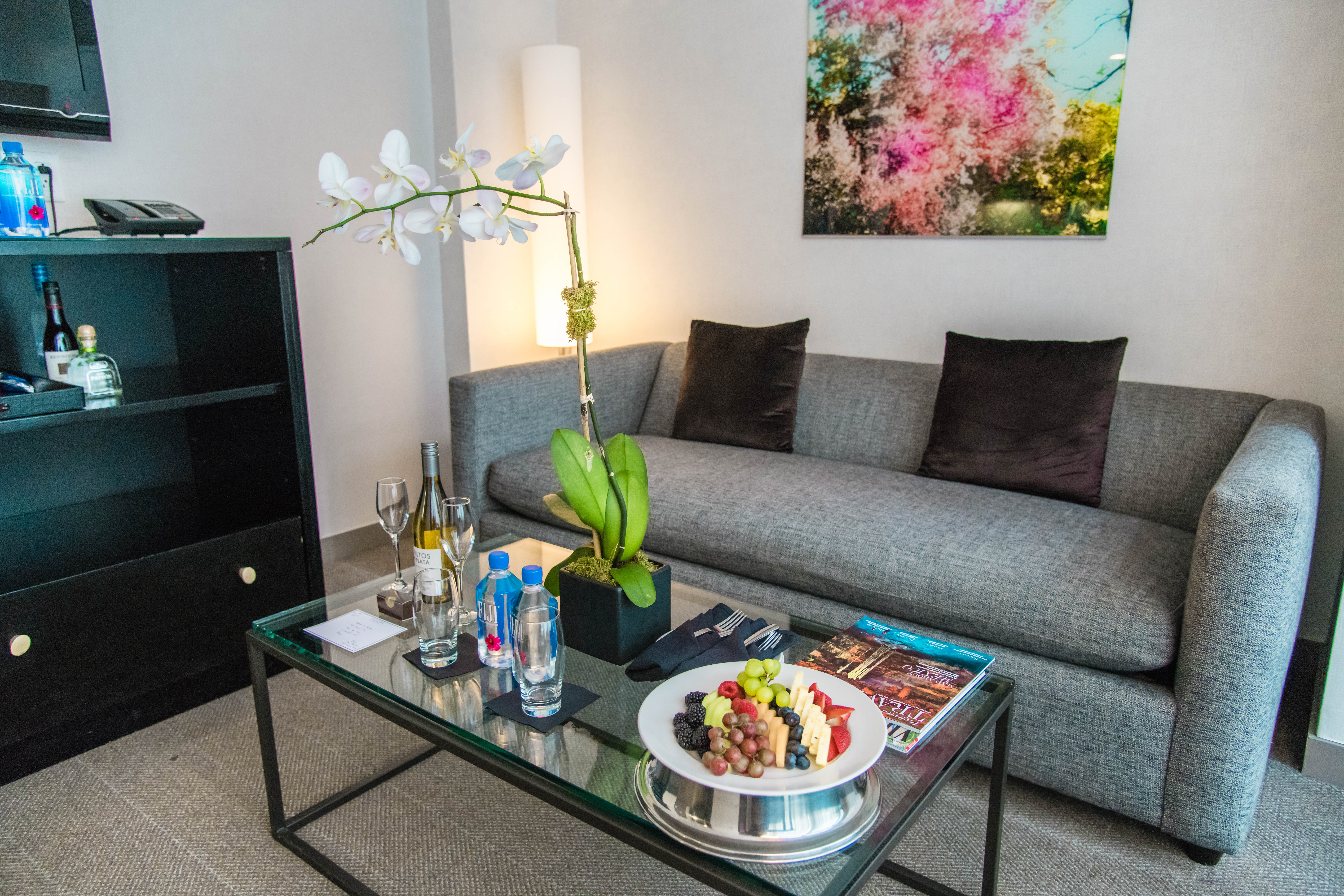 The suite has a separate bedroom from the living space with a king size bed and it comes with an extra pull out bed comfortable enough to host 2 additional guests. In addition to the large space, it also features a small kitchenette equipped with all the fixtures and dishes necessary for dining in. I particularly liked having the fridge and microwave in the suite, because it meant I could have NYC pizza on-demand whenever I wished!