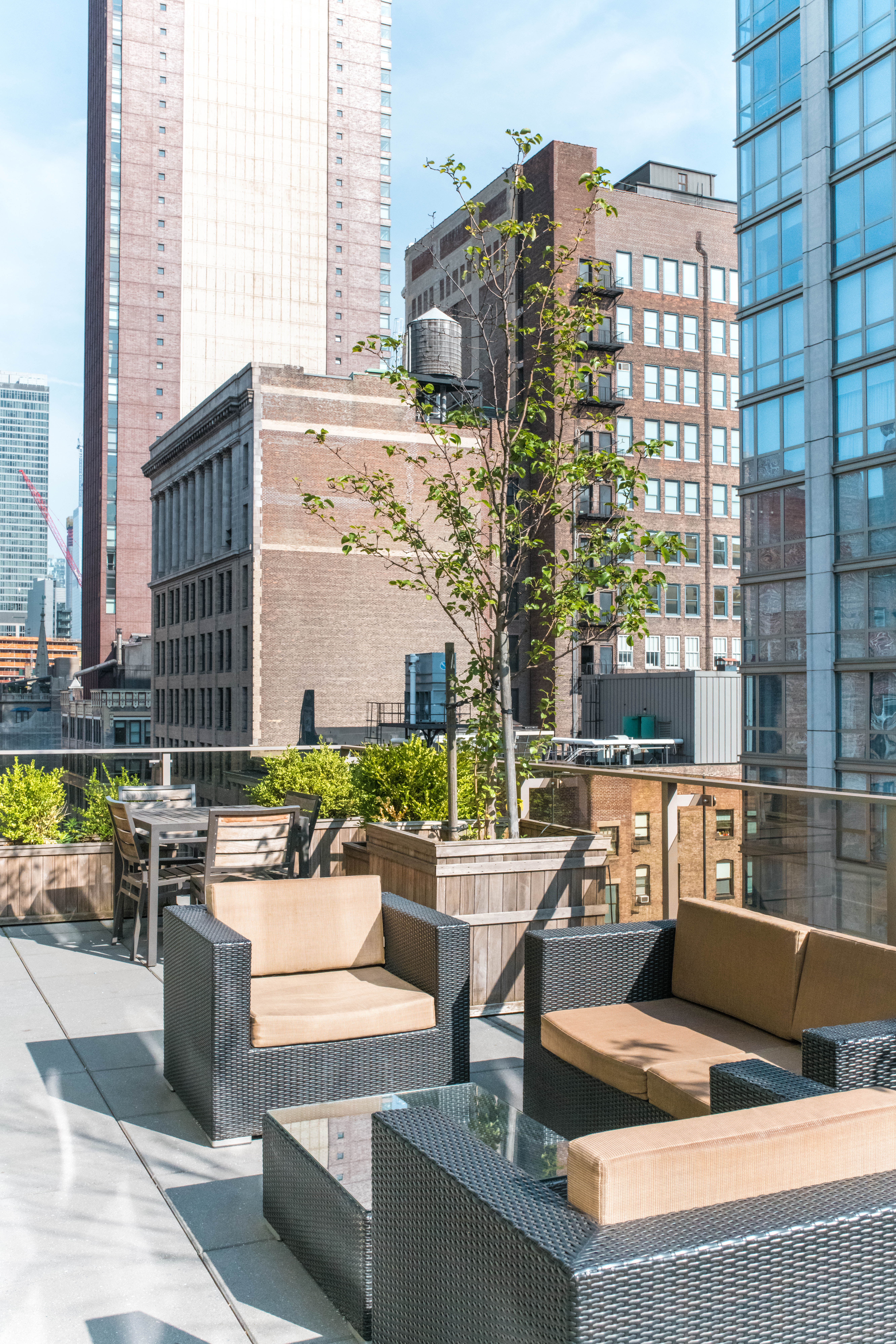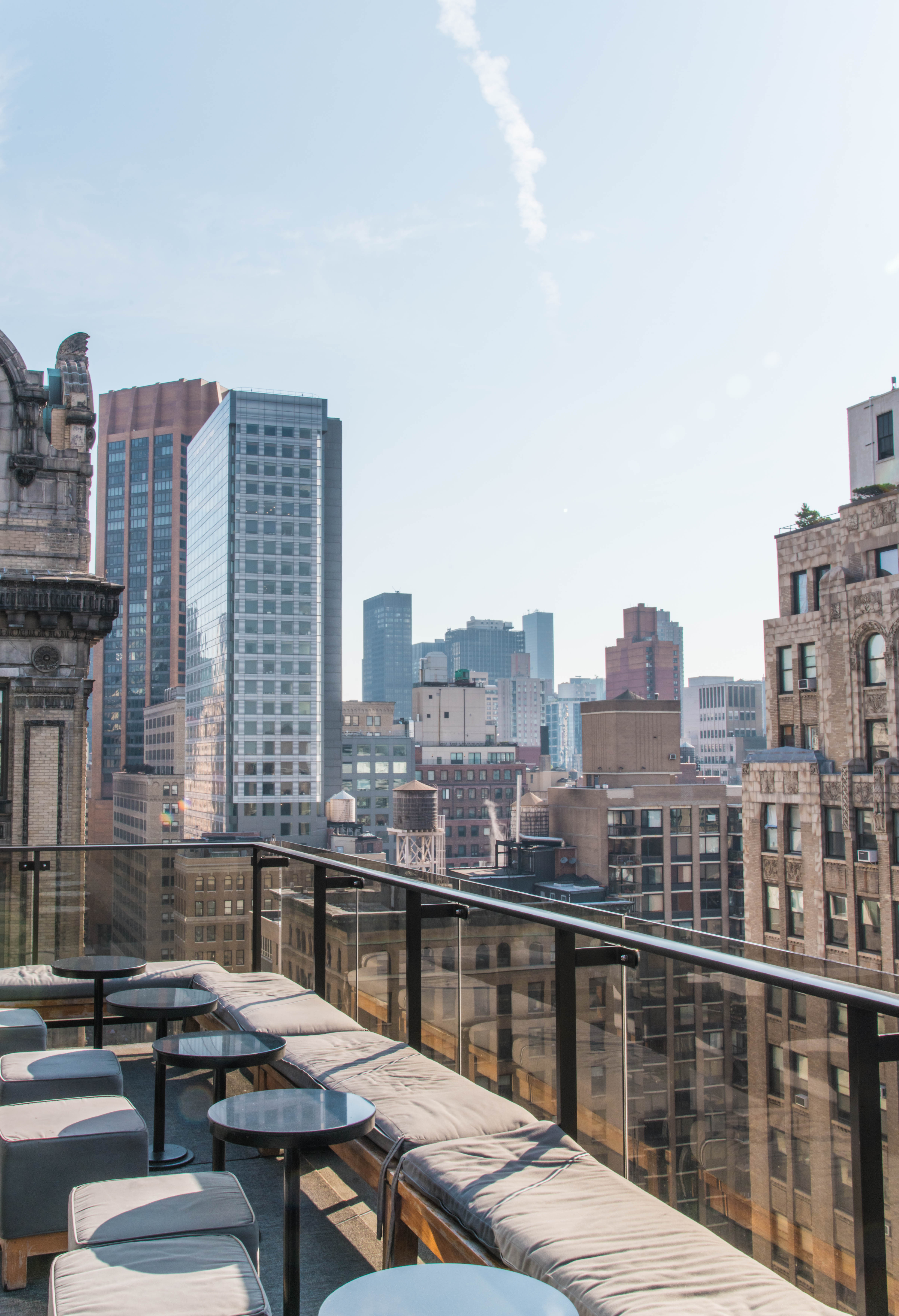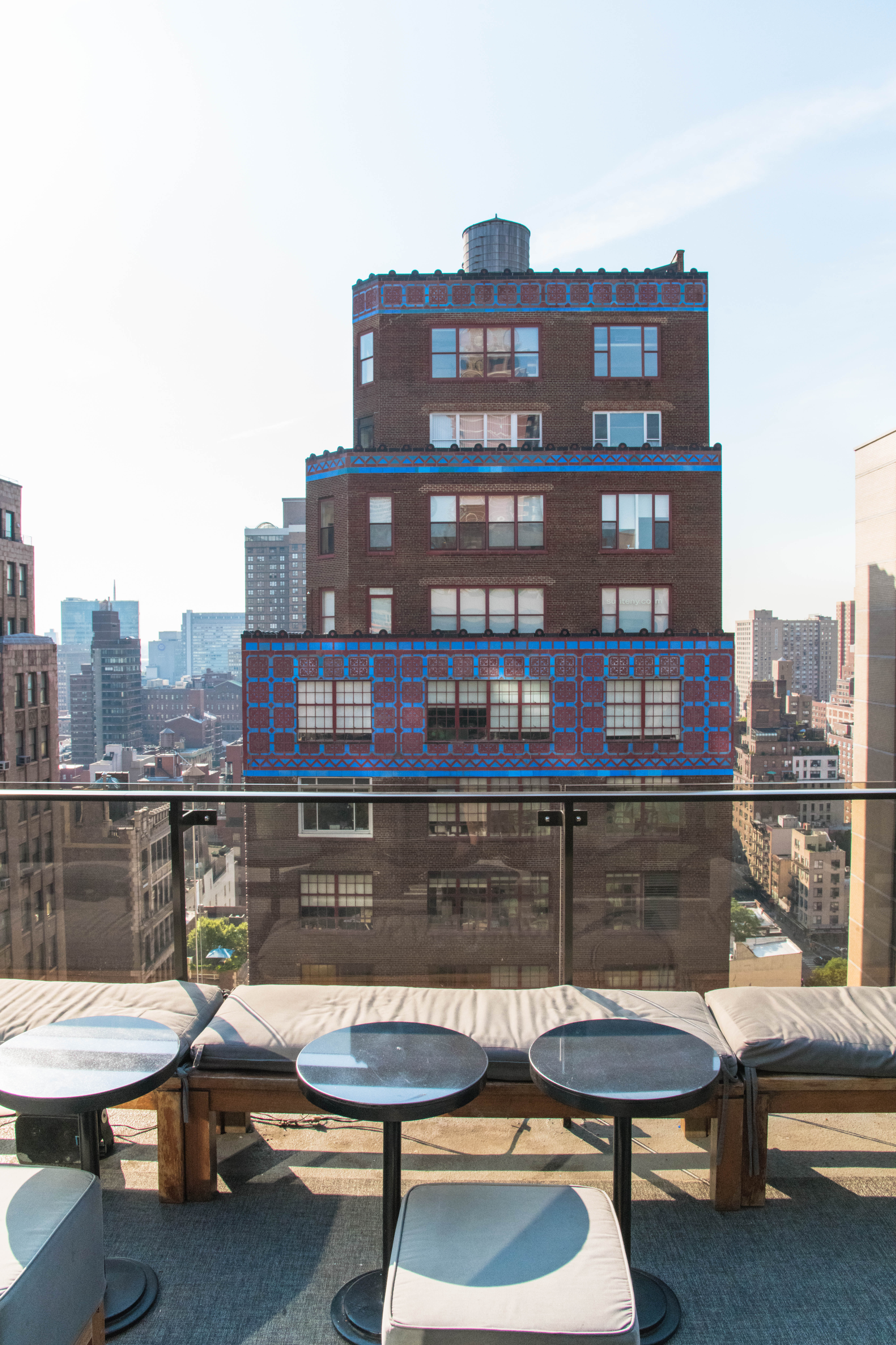 The second rooftop, located 2 stories above the pool deck, had a fun boathouse style vibe with white all furniture and grassy green walls. The Sundeck is full of sunshine and serves up panoramic views in all directions of Manhattan. Perfect for watching the sunset over the West of the city.