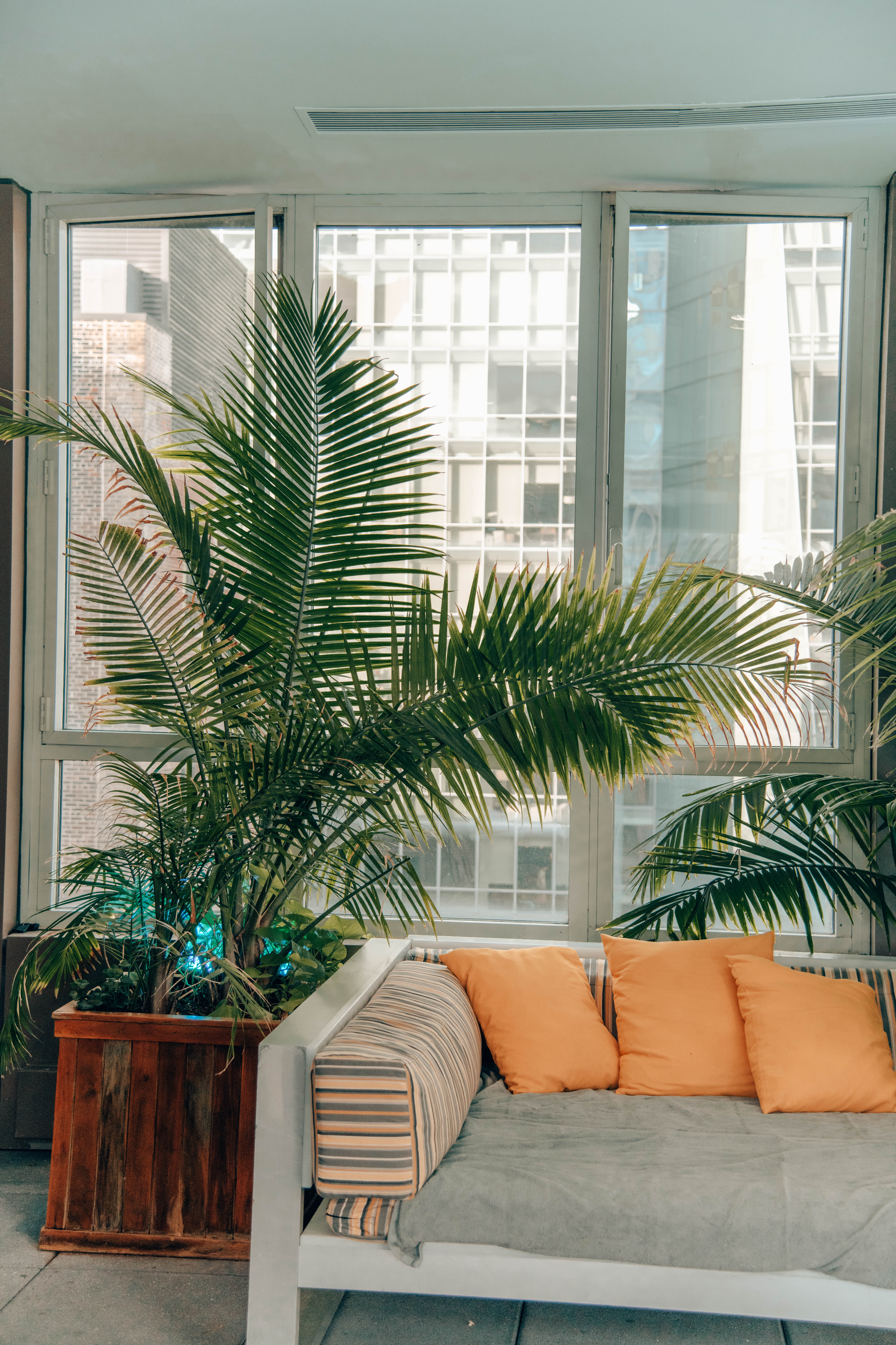 The deck opens at 7 am and immediately begins to fill up as guests come to lay out in the morning sun. Fortunately, there is plenty of comfortable seating with both loungers and couches in the sun and in the shade. The decor is fresh and bright with pops of yellow and green paired with the magnificent city skyline as the backdrop.