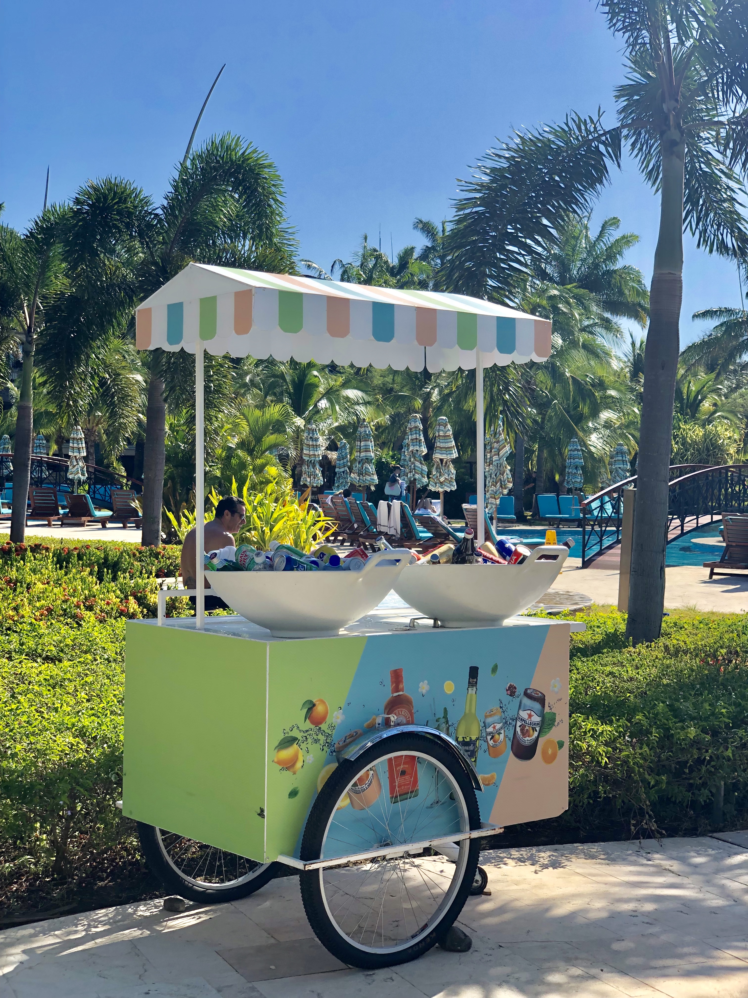 The vibes are very tropical with towering palm trees surrounding the space. The pool service is excellent and staff are always there to tend to you. They also have stations set up along the sides offering tropical cocktails and coconuts for refreshments.